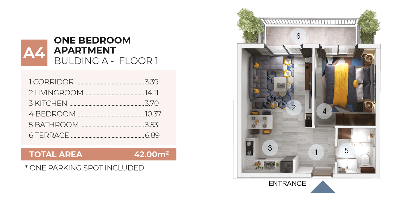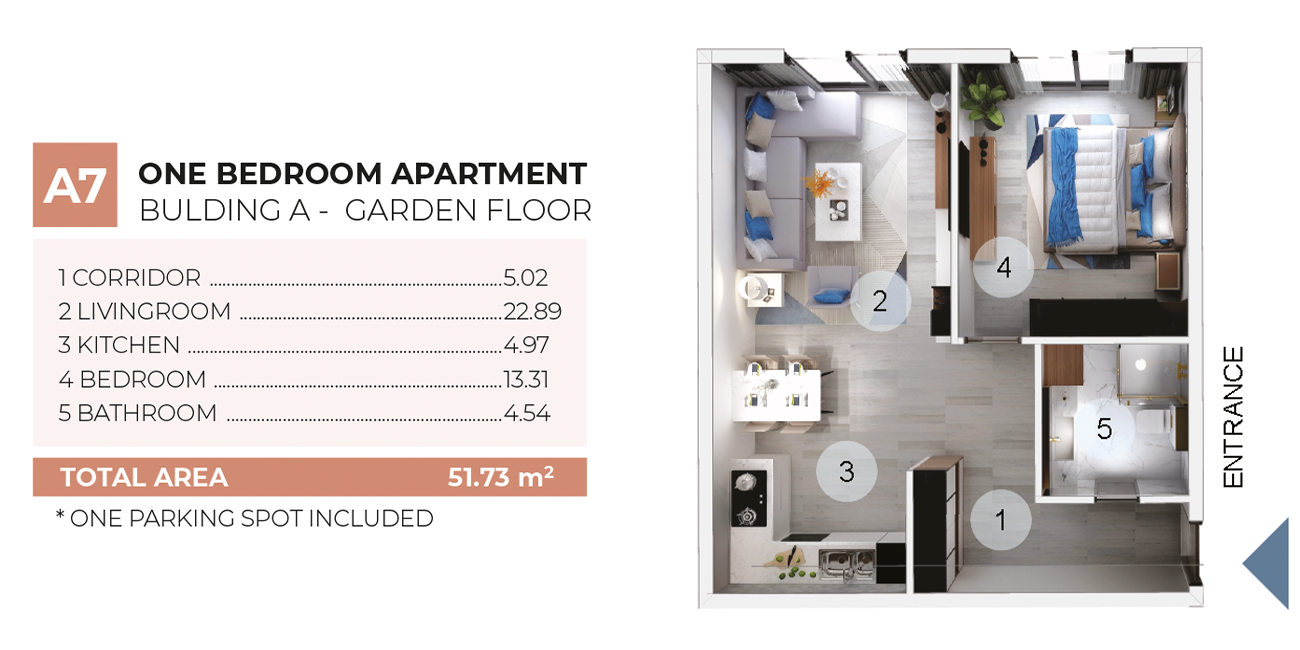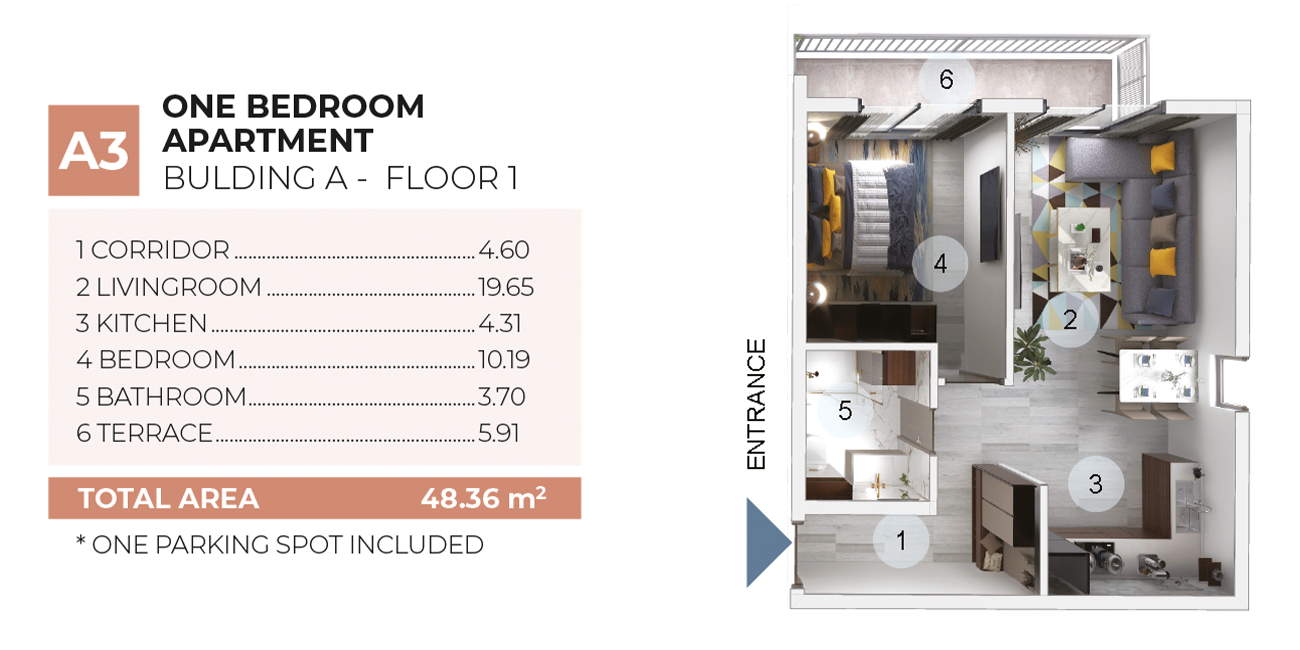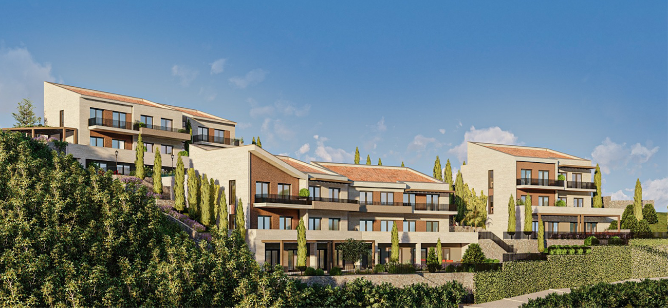 The complex consists of 3 buildings: building A, B, and C, between which there are spaces for recreation, a swimming pool, a children’s playground and spacious green areas.A block is oriented towards the sea, creating the atmosphere of a Mediterranean place in the spirit of local tradition.They are positioned so that in the upper part of the plot there is building A.In order to provide more free space and green areas, parking is dominantly placed in the garage, which is located under the buildings.Each of the buildings consists of a garden floor, and two level floors where the apartments are located.