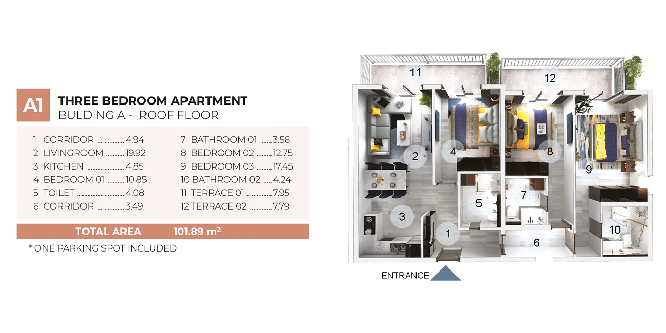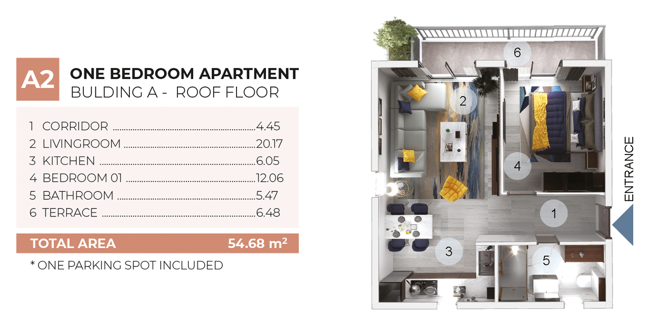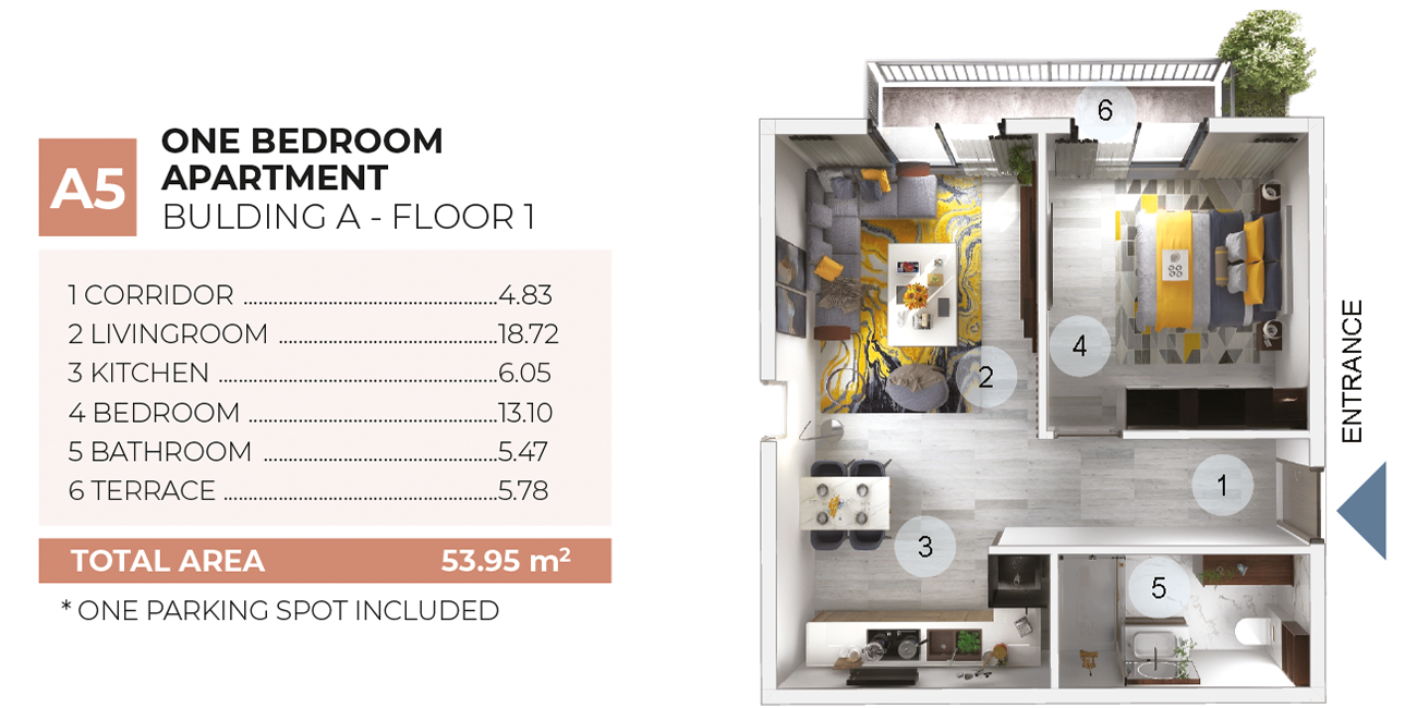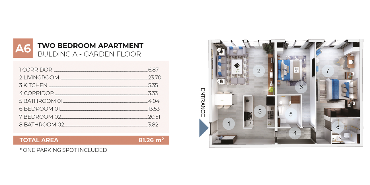 The complex consists of 3 buildings: building A, B, and C, between which there are spaces for recreation, a swimming pool, a children’s playground and spacious green areas.A block is oriented towards the sea, creating the atmosphere of a Mediterranean place in the spirit of local tradition.They are positioned so that in the upper part of the plot there is building A.In order to provide more free space and green areas, parking is dominantly placed in the garage, which is located under the buildings.Each of the buildings consists of a garden floor, and two level floors where the apartments are located.
